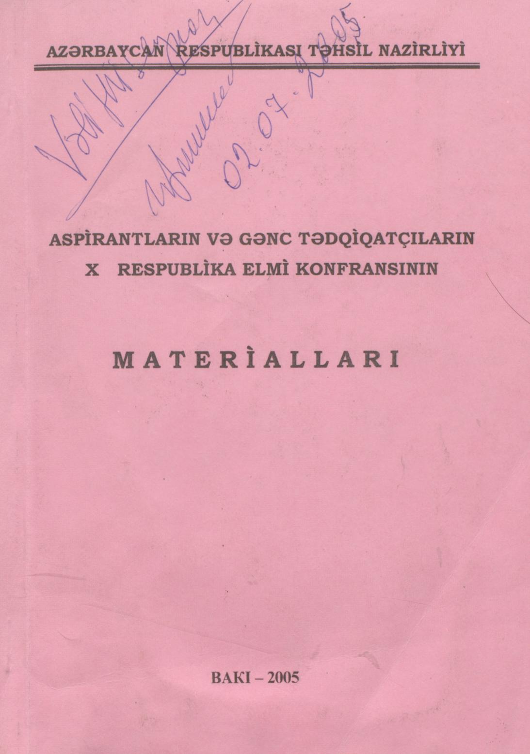 Kitaba aspirantların və gənc tədqiqatçıların X respublika elmi konfransının materialları daxil edil…